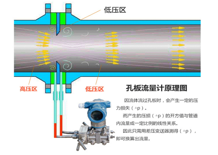 當(dāng)流體經(jīng)管道內(nèi)的節(jié)流裝置時(shí),流速將在節(jié)流裝置的節(jié)流件處形成局部收縮,從而使流速增加,靜壓力低,于是在節(jié)流件前后便產(chǎn)生了壓力降,即壓差,介質(zhì)流動(dòng)的流量越大,在節(jié)流件前后產(chǎn)生的壓差就越大,所以孔板流量計(jì)可以通過測(cè)量壓差來衡量流體流量的大小。這種測(cè)量方法是以能量守衡定律和流動(dòng)連續(xù)性定律為基準(zhǔn)的。